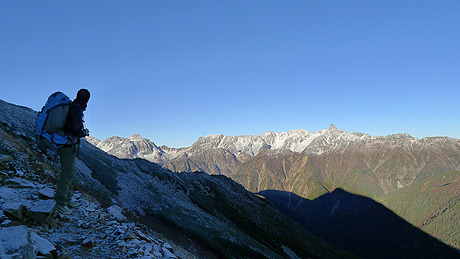 ※常念岳の登り途中。槍ヶ岳から大キレットが美しい。6:49