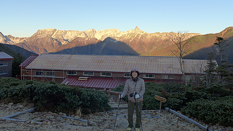 ※常念小屋の前で。槍ヶ岳方面の朝焼けが美しい! 6:10