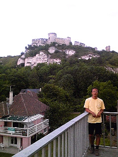 今日の泊まりはガイヤール城の真下のBar・Restaurant兼Hotel。名前は一応『Auberge du Pont』。部屋はバーの裏の2階で微妙な配置だが、ドアを開けるといきなりガイヤール城が見えてなかなか良い。不思議なBar(Restaurant)で、夜の営業時間はたったの2時間(19時~21時)。夕食はここで食べたが、品書き無し(定食のみでA la carteは無いようだ)、前菜はセルフサービス(?)、店主も客もなんだか変わってる。でも昨夜のレストランより美味しくて、かなり安かった。