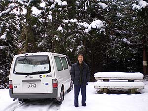 チェーン初使用がこんなギリギリのシチュエーション、『側溝に落ちてレッカーを呼んだらいろいろ言われちゃうんだろうな、恥ずかしいな、』などと頭によぎり、かなり緊張したがなんとか脱出成功。 その先も積雪はかなり多く、峠の駐車場は15cmくらい積もっていた。