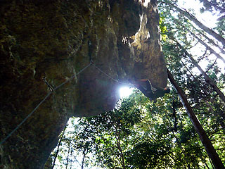岩場に着いた時は濡れていたが、午後、見る見るうちに乾いてきたのでやってみる事にした。見た目どおり、出だしの一手目からジムナスティックなムーブが続く。3本目のクリップと、5本目直前のムーブが核心か?・・・パワフルでとても面白い。