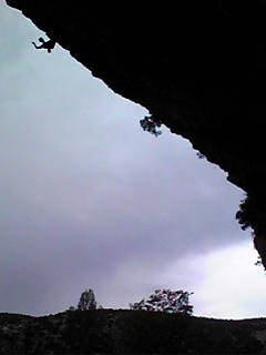 そこは短めのルートが多いが壁が非常に被っていて、上部は脆いのか(?)壁の途中で終わるルートが多く、取り付き・荷物置き場を含めて全く濡れない。雨は時々かなり強く降っが、一日楽しめた。