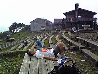 ▼写真は塔の岳頂上(1491m)に着いてバテバテで寝ているところ・・・。 後ろは尊仏山荘。