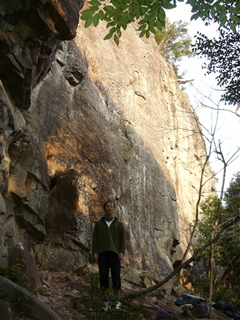 取り付きの雰囲気は甲府幕岩にそっくり。岩質は湯河原幕岩や城山、甲府幕岩と同じ安山岩で、縦スケールは倍くらい。・・・しかし、残念ながら岩の密度はだいぶ低くて、上部はポロポロのところが多い。ホールドの剥離も多くて、グレードが安定しないようだ。