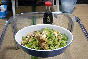 今晩はオクサンが、昨日丹沢で買ったゴーヤを使ってゴーヤチャンプルを作ってくれた。